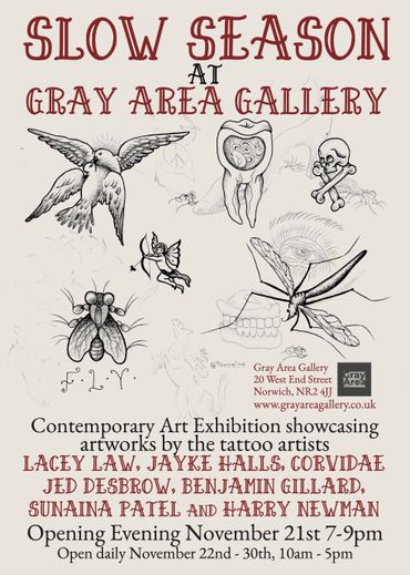 An exhibition inspired by the downtime of the tattoo world where bookings slow down offering artists time to focus on their artistic practices. Featuring Lacey Law, Jayke Halls, Corvidae, Jed Desbrow, Benjamin Gillard, Sunaina Patel and Harry Newman this exhibition is set to be a diverse celebration of self expression beyond tattooing.